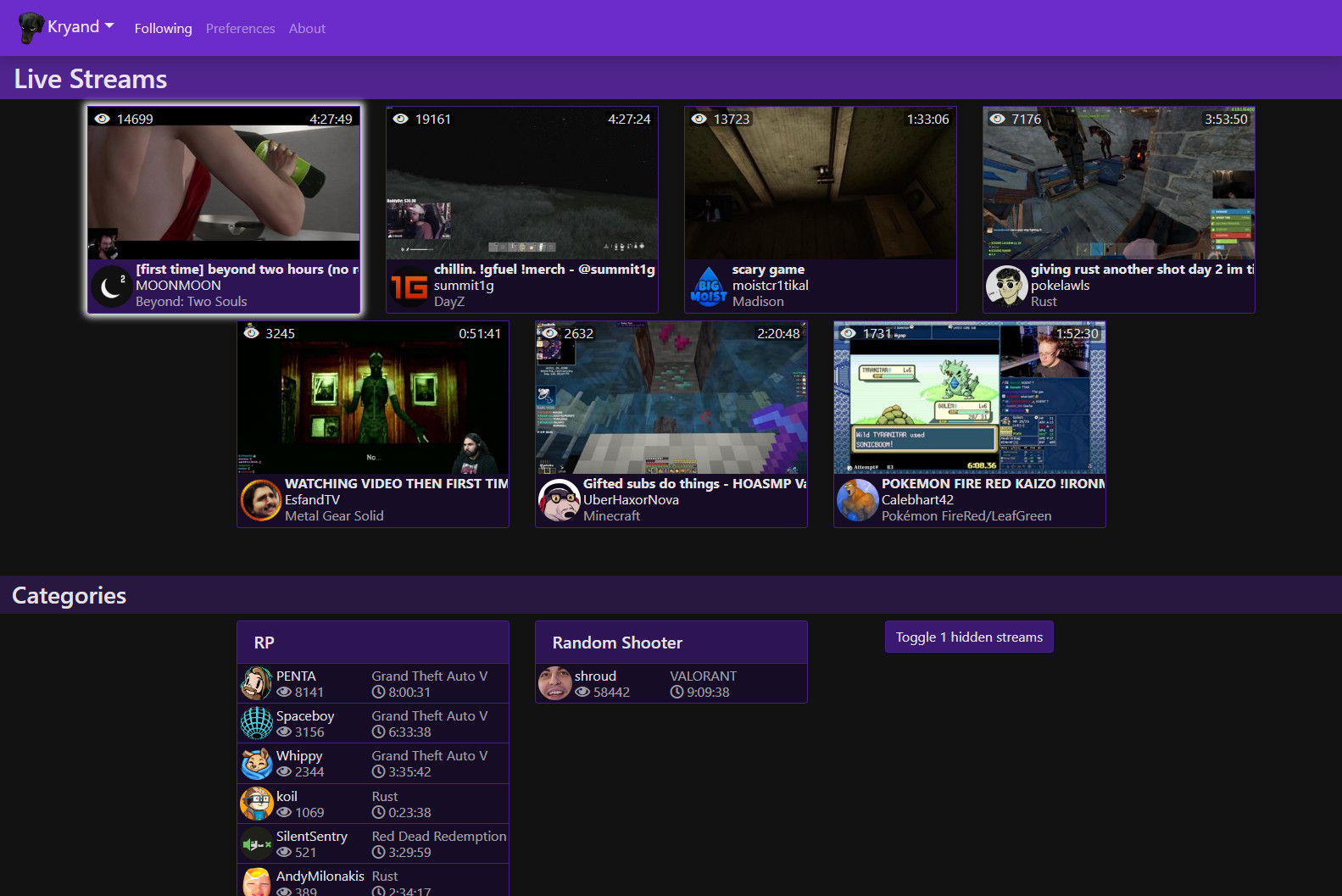 Once you've set up a rule in this way, you can manage all of your rules on the 'Preferences' page. You can also use that page to change how categories will appear. Normally, all categories will appear in a box under the main stream list. However, you can set certain categories to appear highlighted in front of all other streams, in order to mark some of your favorite streams. You can also set some categories to be hidden, for when a streamer is playing League of Legends or World of Warcraft, or y'know, whatever.